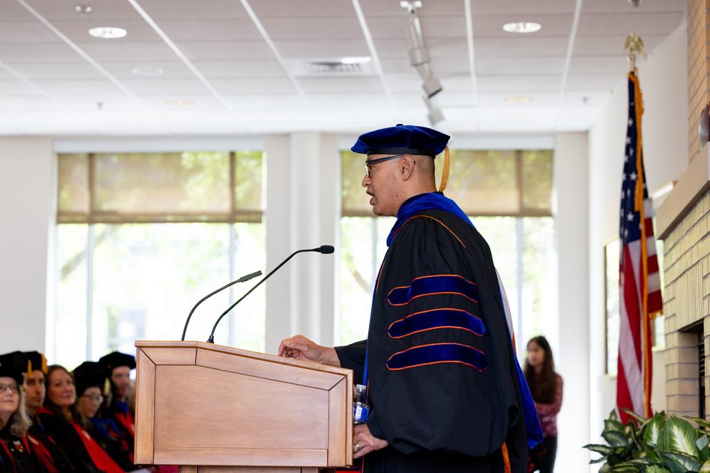For the first year, the School of Pharmacy’s Health Services Research in Pharmacy and Pharmaceutical Sciences graduate programs held their very own Hooding and Recognition Ceremony — a move inspired by the graduates themselves and the fast growth of the School’s new master’s degree programs in Applied Drug Development and Psychoactive Pharmaceutical Investigation. The ceremony on Friday, May 10, at the Pyle Center featured keynote speaker CEO of Concert Pharmaceuticals Roger Tung (PhD ’87), Pharmacy Alumni Association President Heather Spatchek (PharmD ’18), and graduate speakers Mika Hess (MS ’24) and Jason Chladek (PhD ’24).